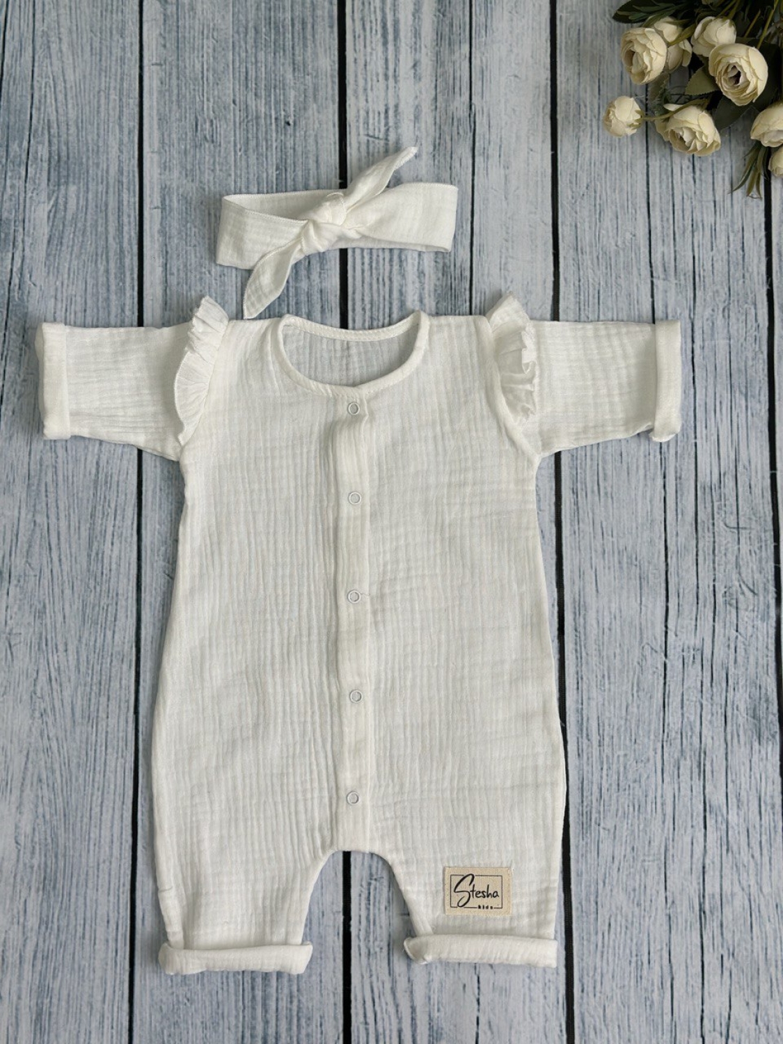 Теги: Купить оптом детский комбинезон . 336-МО. Комбинезон с повязкой для девочки из муслина, хлопок 100%, размеры 56,62,68, молочный цена,отзывы официальный сайт "Стеша Гатчина"